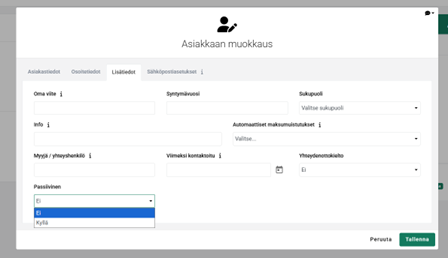 Voit passivoida asiakkaan muokkausnäkymässä kuvassa näkyvästä kentästä, valitsemalla Kyllä. Jos asiakkaaseen liittyy lasku, tarjous tms. niin silloin sitä ei voi poistaa ja tällöin passivointi on ainoa tapa. Kuva tässä liitteenä.