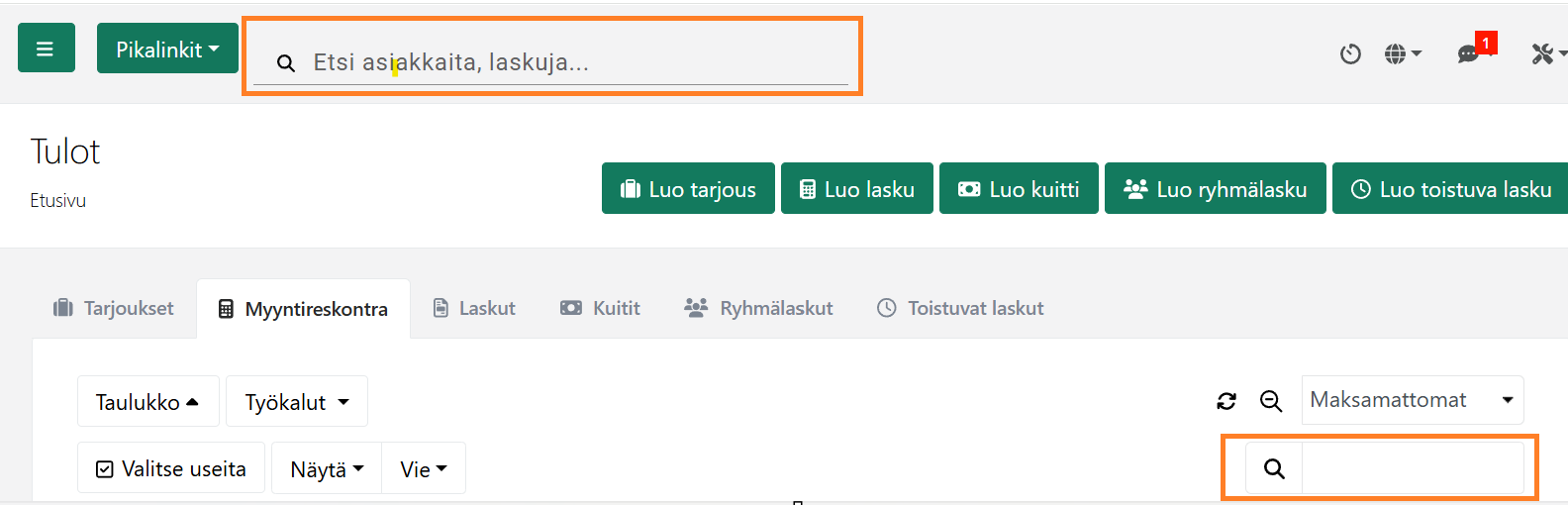 Voit hakea laskua viitenumerolla Pikalinkit -pudotusvalikon vieressä olevan hakukentän kautta tai voit hakea laskua suoraan kohteesta, esim. Tulot -> Myyntireskontra -välilehdellä sijaitsevasta hakukentästä. Huomioitavaa on, että Myyntireskontra -sivulla oleva hakukenttä hakee vain pudotusvalikkoon tehdyn valinnan perusteella, kuten ao. kuvassa maksamattomista laskuista.