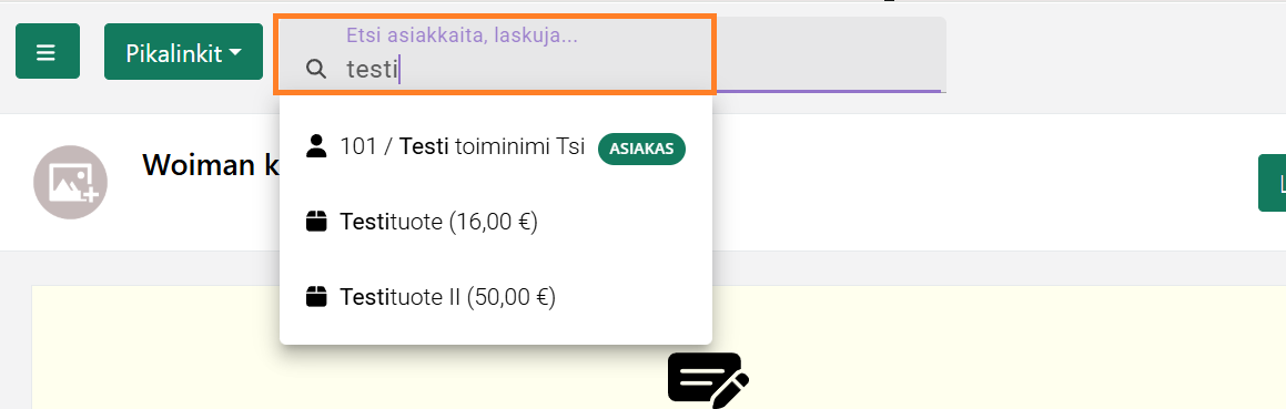 Pikalinkit -pudotusvalikon vieressä oleva hakukenttä hakee kenttään kirjoitettua tietoa kaikista Laskupisteen osista. Tämän hakukentän kautta on siis helpoin tapa etsiä asiakkaita, laskuja, tuotteita jne. Pääset siirtymään suoraan ko. tietoon listassa olevan tiedon sisältämän linkin kautta.